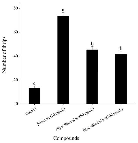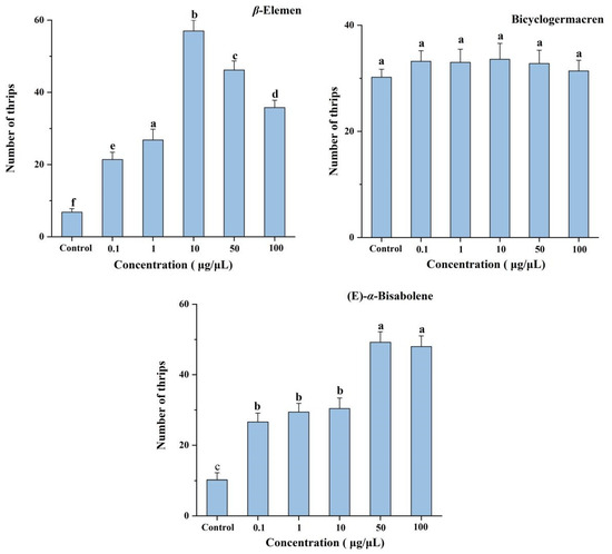 As mentioned above, the most attractive concentration of β-elemen was 10 μg/μL, and the most attractive concentrations of (E)-α-bisabolene were 50 and 100 μg/μL. Compared with the control (mineral oil), although both β-elemen and (E)-α-bisabolene at their respective optimal concentrations were significantly more attractive to T. hawaiiensis (F = 284.03; df = 3, 16; p < 0.001) (Figure 4), T. hawaiiensis significantly preferred β-elemen to (E)-α-bisabolene, but showed no significant difference in the olfactory preference between 50 and 100 μg/μL of (E)-α-bisabolene.