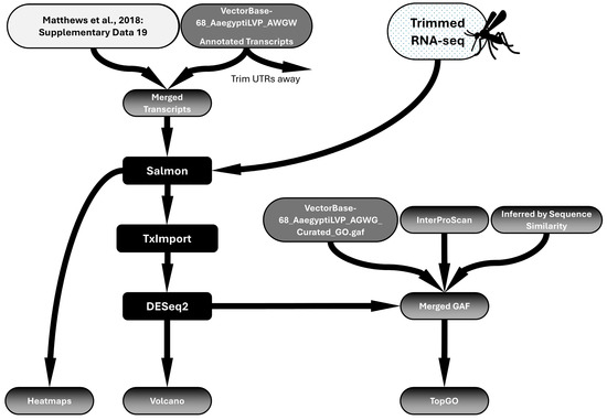 Workflow of RNAseq differential expression analysis. A transcriptome, updated to include chemoreceptor annotations, was constructed by merging the publicly available annotated transcriptome (VectorBase) with the supplementary file provided in Matthews et al. (2018) [19] entitled “Supplementary Data 19—Figure 2—ChemoreceptorCodingSequences.fasta”. An updated GAF file was also constructed by adding chemoreceptor GAF annotations (from InterProScan and Sequence Similarity Inference) to the publicly available VectorBase GAF file. Salmon pseudoalignment was performed to align trimmed reads to the transcriptome. TxImport and DESeq2 analysis were performed to identify differentially expressed genes. Heatmaps, volcano plots, and TopGO anlysis were performed to visualize data.