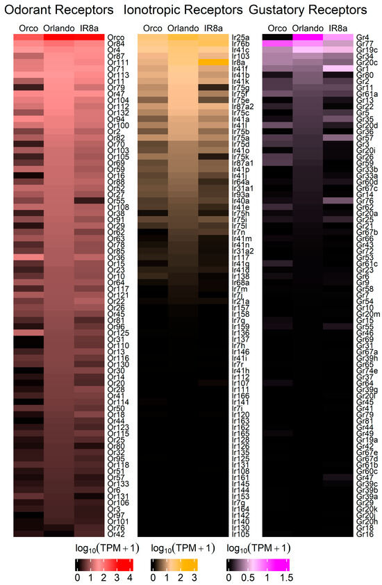 - Clyne, P.J.; Warr, C.G.; Freeman, M.R.; Lessing, D.; Kim, J.; Carlson, J.R. A novel family of divergent seven-transmembrane proteins: Candidate odorant receptors in Drosophila. Neuron 1999, 22, 327–338. [Google Scholar] [CrossRef]