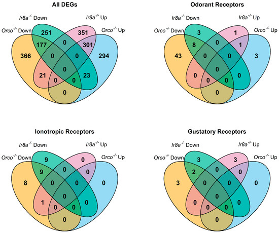 Venn diagrams showing overlap of DEGs across antennae samples as identified by DESeq2 analysis. In each diagram, the regions are labeled by the mutant strain and whether the genes are significantly over-represented (Up) or under-represented (Down) when compared to wildtype. All DEGs are considered, as well as subsets of chemoreceptor genes including Ors, Irs, and Grs.