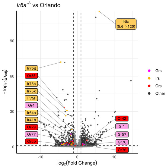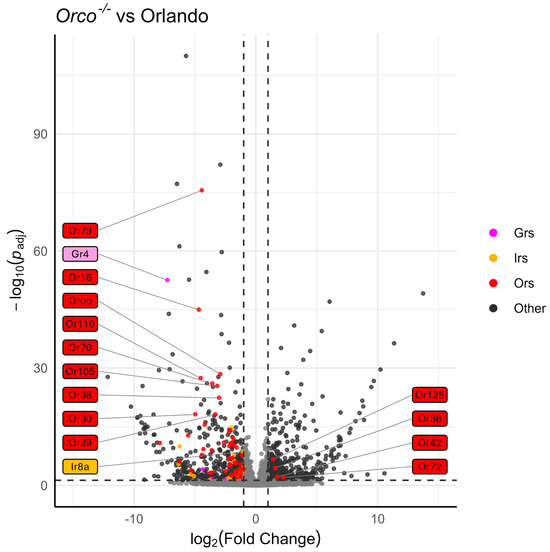 Heatmaps of the TPM values for the major chemoreceptor families were generated to visualize gene expression comparisons across samples (Figure 2). Potential differences in magnitude in wildtype versus mutant antennae across all three gene families were broadly evident, even before differential expression analysis was performed (Figure 2). DESeq2 comparisons revealed significant differential expression of genes between strains (Supplementary Files S12 and S13). Genes were classified as differentially expressed if p-Adj < 0.05 and absolute log2 fold change was >1 [75]. More than 1700 DEGs were identified across samples (Figure 3). Chemoreceptor genes were significantly under-represented in the Orco−/− strain, supporting our initial hypothesis (Figure 3 and Figure 4). A total of 51 Ors, including Orco, 18 Irs, including Ir8a, and 5 Grs were significantly under-represented, while Or36, Or42, Or72, and Or125 were significantly over-represented (Figure 3 and Figure 4).
