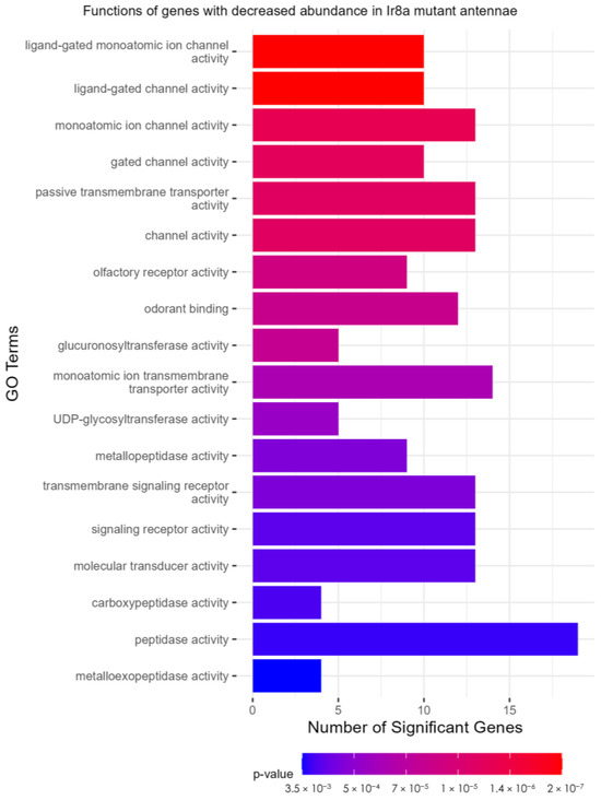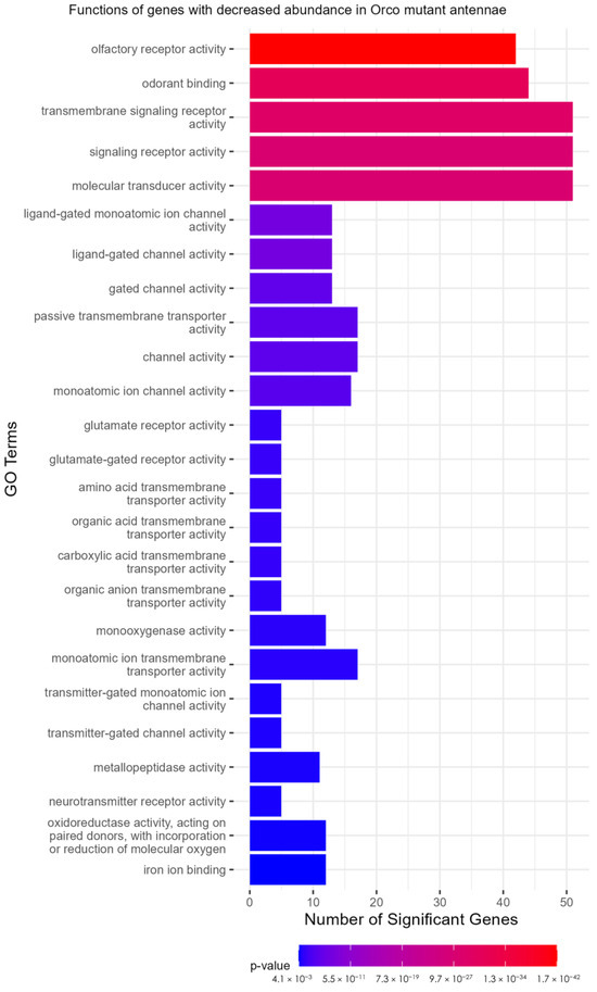 A TopGO analysis (Supplementary Files S14 and S15) was performed to identify the molecular functions of genes that were significantly under- or over-represented in the Orco−/− strain. Strikingly, among the under-represented GO terms, 17 of 25 with the lowest p-values were descriptive terms for chemoreceptors. These included terms such as “olfactory receptor activity” (p = 1.71 × 10−42), “odorant binding” (p = 2.58 × 10−31), “ligand-gated channel activity” (p = 3.92 × 10−8), and “glutamate receptor activity” (p = 3.78 × 10−4) (Figure 5). This analysis shows that not only are the molecular functions of olfaction significantly reduced in Orco mutants, but that only a few other molecular functions are affected to the same level of significance (p < 0.005). GO terms associated with over-represented DEGs in Orco−/− antennae were associated with peptidases (serine-type endopeptidase activity: p = 1.23 × 10−6), suggesting that in Orco mutant antennae, proteolytic cleavage is increased (Figure S5).