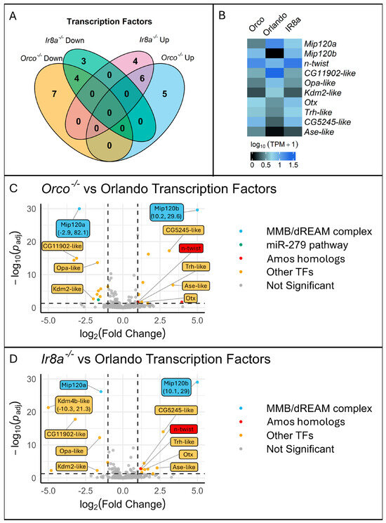 Visualization of the transcription factor differential expression shows two Mip120 homologs (Mip120a and Mip120b), members of the MMB/dREAM complex, along with other TFs including an n-twist, a neuronal differentiation TF with sequence similarity to the D. melanogaster chemosensory TF amos to be significantly differentially expressed. (A) A Venn diagram shows the overlap between Orco−/− and Ir8a−/− mutants of differentially expressed TFs compared to the wildtype. Each number represents the number of differentially expressed TFs within each category. (B) A heatmap of the relative expression levels for the 10 differentially expressed genes in common to both co-receptor mutants. (C,D) Volcano plots showing differentially expressed TFs in Orco−/− or Ir8a−/− relative to the wildtype. Any datapoints that were not TFs were filtered out prior to visualization. Labels were added to the ten DEG TFs in common to both mutant strains. The Y-axis was confined to 30, and the X-axis was confined to |5.0|. Any points with X or Y values outside of those limits were plotted on the edge of the graph, labels were added, and the X,Y coordinates were included in the label.