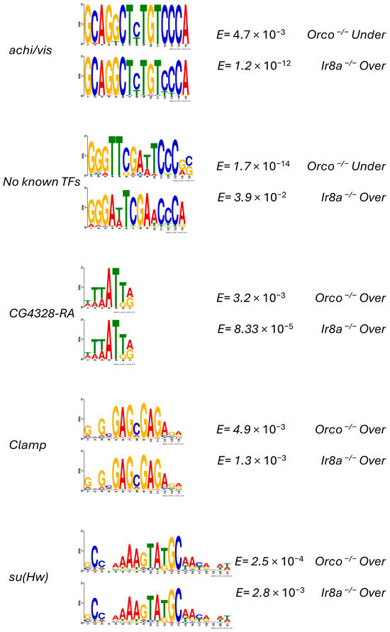 The XSTREME motif discovery and enrichment algorithm was used to identify potential cis-regulatory elements in the regions 2000 bp upstream of the TSS for DEGs. Within these promoter regions, eight motifs were identified in Orco−/− under-expressed DEGs, ten in Orco−/− over-expressed DEGs, three in Ir8a−/− under-expressed DEGs, and twenty-five in Ir8a−/− over-expressed DEGs. Enriched motifs were compared between DEG categories. While the threshold for XSTREME analysis was set at E < 0.005, the algorithm also returned the top three motifs identified by SEA (Simple Enrichment Analysis), even if the E values were greater. Five motifs are highlighted below for further consideration. Two motifs, the first similar to those recognized by achi and vis in D. melanogaster and the second with no known TFs associated, were found in the upstream regions of Orco−/− under-expressed DEGs and Ir8a−/− over-expressed DEGs (Figure 9). Three motifs were enriched in the upstream regions of over-expressed DEGs in both mutants. These motifs are identical to the D. melanogaster motifs recognized by CG4328-RA, Clamp, and su(Hw).