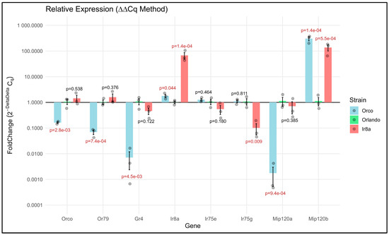 To confirm the results of RNAseq, qRT-PCR analysis using the ΔΔCt method was conducted on a subset of differentially expressed genes. These included Orco, Or79, Gr4, Ir8a, Ir75e, Ir75g, Mip120a, and Mip120b. Primers were designed for amplification of cDNA only by ensuring that at least one primer in each set spanned an exon–exon junction. Three replicate colonies each of Orlando, Orco−/−, and Ir8a−/− strains were reared under the same conditions described above until adults were 5–7 DPE. At ZT = 0, adult mosquitoes were frozen and female antennae were dissected into Trizol reagent. RNA was extracted as described above. SuperScript IV Reverse Transcriptase (Invitrogen, Waltham, MA, USA) was used to produce cDNA from ~220 ng of RNA from each sample, which were each split equally to perform +RT and −RT reactions.