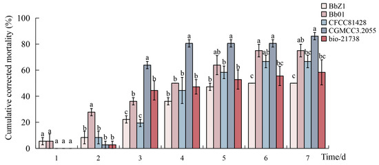 The cumulative corrected mortality of D. sylvestrella larvae induced by different B. bassiana strains. Different lowercase letters indicate statistically significant differences in the cumulative corrected mortality among different strains at the 0.05 level within the same time period (Duncan’s test, p < 0.05).