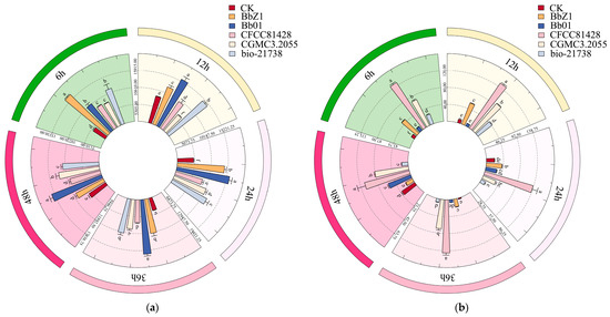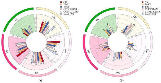 Data processing: Data calculations were performed using Excel 2016, with the cumulative corrected mortality calculated as [(cumulative mortality of the treatment group−cumulative mortality of the control group)/(1−cumulative mortality of the control group)] × 100% [16]; one-way analysis of variance (ANOVA) was conducted using IBM SPSS Statistics 27 to test the significance of differences among different treatments via Duncan’s multiple comparison method at a significance level of 0.05, while the natural logarithm transformation of the number of dead insects was carried out through the probit analysis method to calculate the toxicity regression equations and median lethal time (LT50) of each strain against the larvae. The circular bar charts were created using R version 4.5.0 within the RStudio Desktop environment, and the circlize and readxl packages were mainly applied.