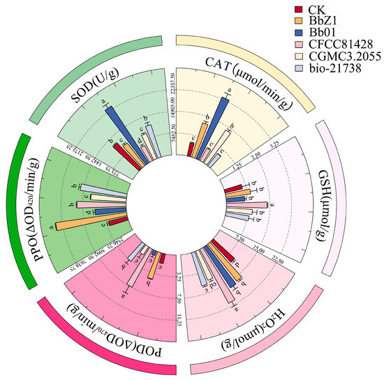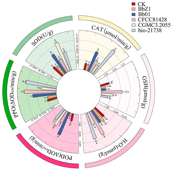 At 48 h post-infection (Figure 7), CGMCC3.2055-treated larvae had the highest SOD activity, exceeding other strains and CK; CFCC81428 and CK had the lowest SOD activity (p < 0.05) with no intergroup difference; and Bb01 and bio-21738 had lower SOD activity than CGMCC3.2055 (p < 0.05). The CAT activities of larvae in each strain treatment group and the CK group showed significant differences (p < 0.05), decreasing in the order of BbZ1, Bb01, CFCC81428, CGMCC3.2055, bio-21738, and CK. The CGMCC3.2055-treated larvae had significantly higher POD activity than Bb01-treated ones, with both exceeding other strain treatments and CK (p < 0.05), while POD activity did not differ significantly among BbZ1, CFCC81428, bio-21738 treatments and CK (p > 0.05). There was no significant difference in the GSH contents of larvae among the BbZ1, CFCC81428, and CGMCC3.2055 treatment groups (p > 0.05), but all were significantly higher than those in the CK group and the remaining strain treatment groups (p < 0.05). The H2O2 contents of larvae showed no significant difference among the CFCC81428, CGMCC3.2055, and bio-21738 treatment groups (p > 0.05), but all were significantly higher than those in the BbZ1 and Bb01 treatment groups and the CK group (p < 0.05). The PPO activity of larvae in the Bb01 treatment group was significantly lower than that in the CFCC81428 group (p < 0.05) but higher than in other strain groups and the CK group (p < 0.05), the PPO activity did not differ significantly between the CGMCC3.2055 and bio-21738 groups (p > 0.05) but was higher than in the CK and BbZ1 groups (p < 0.05), and there was no significant difference in PPO activity between the CK and BbZ1 groups (p > 0.05).