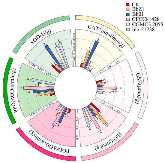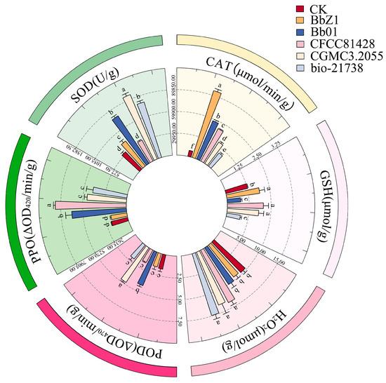 Effects of different B. bassiana strains on the main redox system of D. sylvestrella larvae at 36 h. Different lowercase letters indicate the statistical differences at the 0.05 significance level (Duncan’s test, p < 0.05) in the relevant activities or contents of the larvae of D. sylvestrella after treatment with different strains.
