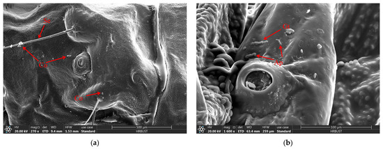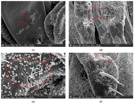 When the larvae of D. sylvestrella were infected with the strain CGMCC3.2055 for 8 h, the conidia (Co) adhered to the epidermis and setae (Se), and tiny bud-like protrusions appeared on individual conidia (Figure 9a). When infected for 16 h, germ tubes (Gts) formed, grew along the epidermis, and the ends and other parts of some germ tubes expanded, resulting in the formation of appressoria (Ap) (Figure 9b). At 24 h post-infection, numerous Gts formed and penetrated the cuticle, with a mucous layer (Mm) visible at the contact site between the germ tube tips and the larval cuticle, indicative of tissue dissolution around the cuticle by the mycelium (Figure 9c). At 48 h post-infection, numerous hyphae (Hy) intertwined around the setal alveoli (Sa), grew along the epidermis, and penetrated it (Figure 9d). However, at 72 h post-infection, it was found that a large number of penetrating hyphae (Ph) had already emerged from the surface of the insect body (Figure 9e). At 84 h post-infection, Hy had spread across the body surface and formed a reticular structure, and new Co began to grow (Figure 9f).