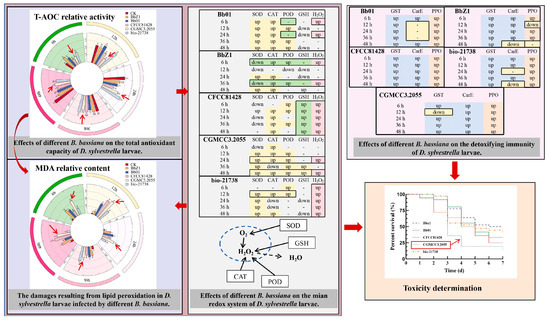 Related conclusions on screening highly pathogenic strains based on the redox reactions, detoxification immunity, and virulence determination of D. sylvestrella larvae after being infected by B. bassiana. In the figures of T-AOC and MDA, the red arrows indicate the activity or content of larvae under the treatment of CGMCC3.2055.
