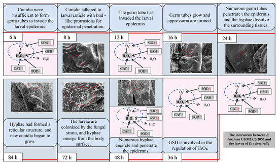 As shown in Figure 11, a combined analysis of the oxidative stress response of D. sylvestrella larvae to strain CGMCC3.2055 and the infection process revealed the following: At 6 h, due to the fact that the conidia have not formed germ tubes to invade the larval epidermis, the oxidative stress response in the larvae is not obvious. At 8 h, the conidia adhere and show bud-like protrusions. At 12 h, the invasion of germ tubes triggers the activation of SOD, CAT, and POD for ROS regulation. At 16 h, the germ tubes grow and appressoria are formed. At 24 h, CAT and POD are insufficient to clear excess H2O2, numerous germ tubes penetrate the epidermis, and the hyphae dissolve the surrounding tissues. At 36 h, GSH is involved in the regulation of H2O2. At 48 h, a large number of hyphae wind around and penetrate the epidermis at easily permeable parts such as the setal sockets of the larvae, and the oxidative stress response is relatively obvious. At 72 h, the larvae are colonized by the fungal strain, and hyphae emerge from the body surface. At 84 h, hyphae form a reticulum and new conidia start growing. This study provides a theoretical basis for the subsequent development of highly effective biological control agents and in-depth exploration of the pathogenic mechanism of B. bassiana against the larvae of D. sylvestrella.