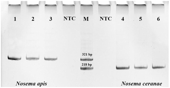 PCR analysis of DNA from the midgut of honey bees using primers specific for Nosema apis (321 bp) and Nosema ceranae (218 bp), where 1–6 are studied samples, NTC is “no template control”, and M denotes markers.