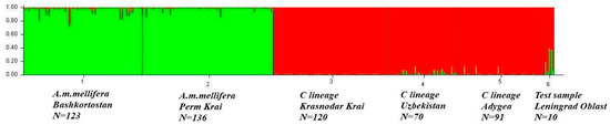 Below is a graph showing the genetic structure of the reference sample. Each vertical line represents a separate sample, and the color indicates the probability that the individual belongs to a particular cluster. The optimal value of K was K = 2 (Delta K = 2035.33820, Figure S1). One cluster was formed by samples of A. m. mellifera from the Republic of Bashkortostan (Burzyan population) and Perm Krai (Perm population). The second cluster included two samples from the southern regions of Russia (Krasnodar Territory and Adygeya) and a sample from Uzbekistan. Each studied sample (sample 6 in Figure 3 shows the sample from Leningrad Region as a test sample) was analyzed separately with the reference samples (Table S1, Figure S1). Among the studied samples, colonies with a gene pool share of M over 88% were identified in the Altai Territory (4 of 8 colonies), Belgorod Region (6 of 29 colonies), Sverdlovsk Region (7 of 12 colonies), and the Republic of Bashkortostan (123 of 199 colonies). The structures of the studied samples for K = 3, 4, and 5 are shown in Figure S1.