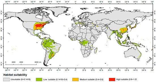 - Lee, C.M.; Lee, D.S.; Kwon, T.S.; Athar, M.; Park, Y.S. Predicting the global distribution of Solenopsis geminata (Hymenoptera: Formicidae) under climate change using the maxent model. Insects 2021, 12, 229. [Google Scholar] [CrossRef]