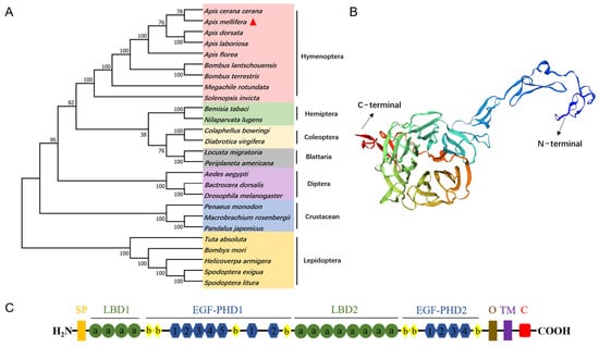 AmVgR bioinformatics analysis. (A) Phylogenetic tree of VgR in Apis mellifera and other insects. (B) Tertiary structure of AmVgR proteins predicted by SWISS-MODEL. (C) Conservative domain analysis of AmVgR. SP: signal peptide; LBD1-2: ligand-binding domain; EGF-PHD1-2: EGF-precursor homology domain; a: LDLR class A repeat (LDLRa); b: LDLR class B repeat (LDLRb); 1–5: YWXD motif; O: potential O-linked sugar domain; TM: transmembrane domain; C: cytoplasmic domain. AmVgR is marked by a red triangle, and all VgR amino acid sequences were downloaded from GenBank (the accession numbers and species names are listed in Table S5).