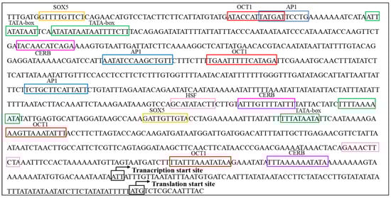 Prediction and analysis of cis-acting elements in the promoter sequence of the AmVgR gene. The transcription and translation start sites are indicated by black arrows, and different cis-acting elements related to oxidative stress and development are marked with different colors. Yellow box: SRY-box transcription factor 5 (SOX5); red box: octamer-binding transcription factor 1 (OCT1); blue box: activating protein-1 (AP1); green box: TATA box; pink box: heat-shock factors (HSFs); purple box: cAMP response element binding protein (CREB).