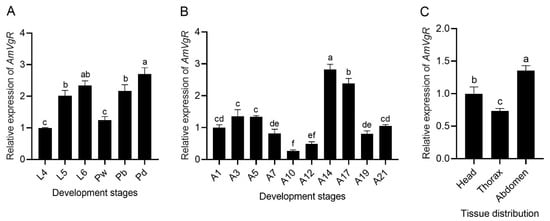 Relative expression levels of AmVgR at different developmental and growth stages as well as in different tissues. (A) Expression of AmVgR in four-day-old to six-day-old larvae (L4–L6), white-eye pupae (Pw), brown-eye pupae (Pb), black-eye pupae (Pd) of worker bees. (B) Expression of AmVgR in one-day-old to twenty-one-day-old adults (A1–A21) of worker bees. (C) Expression of AmVgR in the head, thorax, and abdomen of worker bees. The data are presented as the mean ± SEM. Distinct letters in the figure denote statistically significant differences (p < 0.05) as determined by Duncan’s multiple-range test, while identical letters indicate no significant difference.