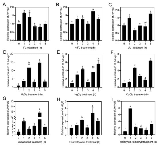 Expression characteristics of AmVgR under different stresses. Treatments included (A) 4 °C, (B) 45 °C, (C) UV irradiation, (D) H2O2, (E) HgCl2, (F) CdCl2, (G) imidacloprid, (H) thiamethoxam, and (I) haloxyfop-R-methyl. The data are presented as the mean ± SEM. Distinct letters in the figure denote statistically significant differences (p < 0.05) as determined by Duncan’s multiple-range test, while identical letters indicate no significant difference.