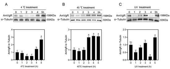Analysis of AmVgR protein expression under different abiotic stresses. (A) Low-temperature treatment at 4 °C. (B) High-temperature treatment at 45 °C. (C) UV irradiation treatment. The data are presented as the mean ± SEM. Distinct letters in the figure denote statistically significant differences (p < 0.05) as determined by Duncan’s multiple-range test, while identical letters indicate no significant difference.