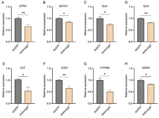 Antioxidant-related gene expression after AmVgR silencing, including (A) GTPX, (B) GSTO1, (C) Tpx3, (D) Tpx5, (E) CAT, (F) SOD1, (G) CYP450, (H) MSRA. * p < 0.05 and ** p < 0.01.