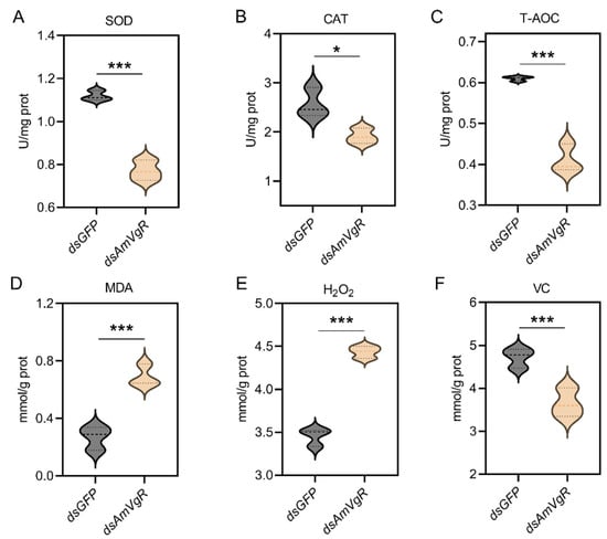 Antioxidant enzyme activity and antioxidant substance content after AmVgR silencing. (A) SOD, (B) CAT, (C) T-AOC, (D) MDA, (E) H2O2, and (F) VC. * p < 0.05 and *** p < 0.001.