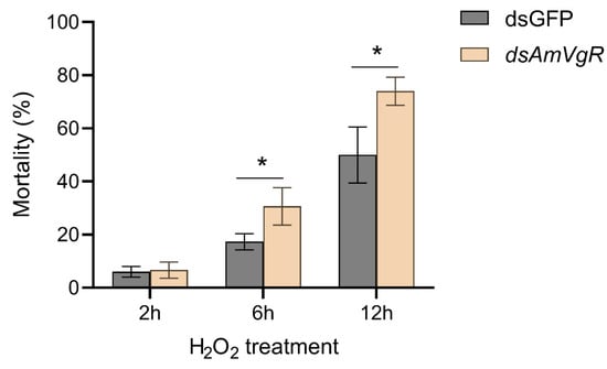 To explore the functional significance of AmVgR in the antioxidant stress responses of Apis mellifera, we subjected bees with silenced AmVgR expression to H2O2-induced oxidative stress. The results indicated that the bees treated with dsAmVgR exhibited significantly elevated mortality rates when compared with the dsGFP control group. Specifically, after six hours of exposure to H2O2, the mortality rate in the dsAmVgR group was 50.00 ± 10.58%, whereas the control cohort demonstrated a considerably lower rate of 13.77 ± 3.06%. After twelve hours of treatment, the mortality rate in the dsAmVgR group further increased to 74.00 ± 5.29%, compared to 30.67 ± 7.02% in the control group (Figure 8). The substantial rise in mortality associated with the silencing of the AmVgR gene during H2O2-induced oxidative stress highlights the critical function of AmVgR within the antioxidant defense mechanisms of Apis mellifera.