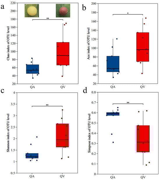Alpha-diversity indices of the symbiotic microbiota of gall wasp Trichagalma acutissimae parasitizing two oak species: (a): Ace index; (b): Chao index; (c): Shannon index; (d): Simpson index. QA and QV stand for Quercus acutissima and Q. variabilis, respectively. * and ** stand for statistically significant at p < 0.05 and p < 0.01 level, respectively.