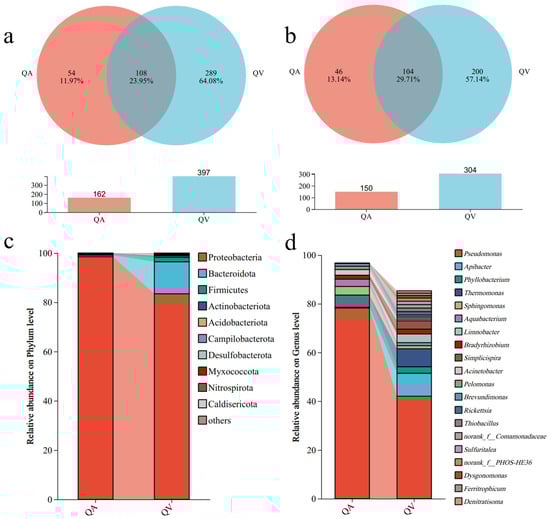 Community composition of the symbiotic microbiota of gall wasp Trichagalma acutissimae parasitizing two oak species: (a): Venn diagram at the OUT level; (b): Venn diagram at the species level; (c): Relative abundance at the phylum level; (d): Relative abundance at the genus level. QA and QV stand for Quercus acutissima and Q. variabilis, respectively.