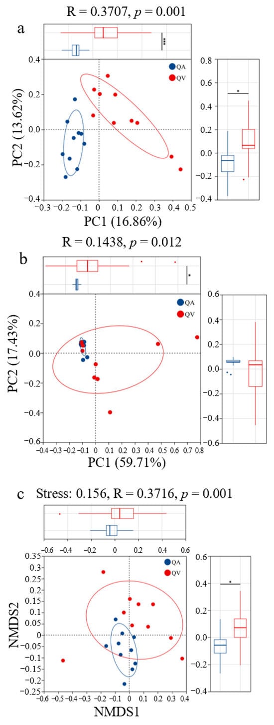 Beta-diversity of the symbiotic microbiota of gall wasp Trichagalma acutissimae parasitizing two oak species: (a): PCoA analysis based on the unweighted UniFrac distances; (b): PCoA analysis based on the weighted UniFrac distances, (c): Non-metric multidimensional scaling (NMDS). QA and QV stand for Quercus acutissima and Q. variabilis, respectively. * and *** stand for statistically significant at p < 0.05 and p < 0.001 level, respectively.