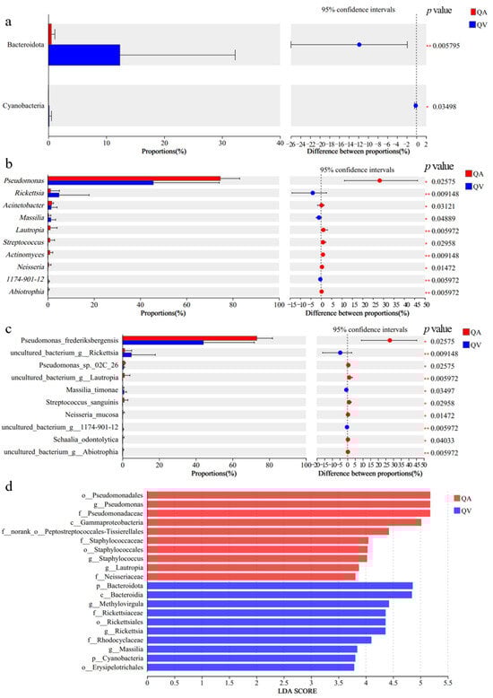 Comparison of symbiotic microbiota of gall wasp Trichagalma acutissimae parasitizing two oak species: (a): Wilcoxon rank-sum test bar plot at the phylum level; (b): Wilcoxon rank-sum test bar plot at the genus level; (c): Wilcoxon rank-sum test bar plot on species level; (d): LEfSe hierarchical tree. QA and QV stand for Quercus acutissima and Q. variabilis, respectively. * and ** stand for statistically significant at p < 0.05 and p < 0.01 level, respectively.