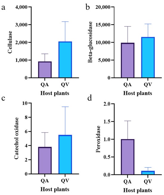 Abundance analysis of enzymes associated with tannin degradation of the gall wasp Trichagalma acutissimae parasitizing two oak species. (a): Cellulase; (b): Beta-glucosidase; (c): Catechol oxidase; (d): Peroxidase. QA and QV stand for Quercus acutissima and Q. variabilis, respectively.