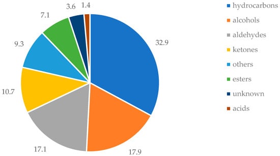 The pronounced presence of hydrocarbons, aldehydes, and alcohols is further illustrated in Figure 1, which presents the relative abundance of major chemical classes detected across the unifloral pollen samples.