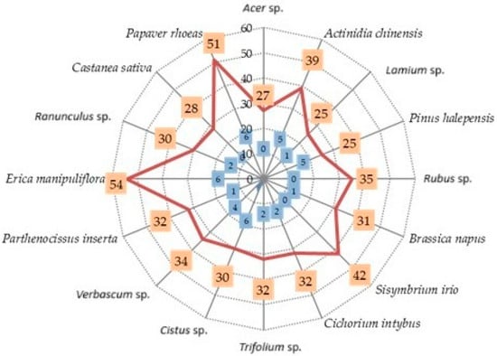 - Dimou, M.; Tananaki, C.; Liolios, V.; Thrasyvoulou, A. Pollen foraging by honey bees (Apis mellifera L.) in Greece: Botanical and geographical origin. J. Apic. Sci. 2014, 58, 11–23. [Google Scholar] [CrossRef]