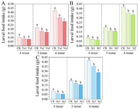 2.3. Determination of Larval Food Intake and Body Weight
