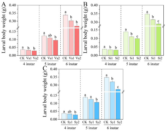 3.2. Changes in Larval Body Weight of S. frugiperda