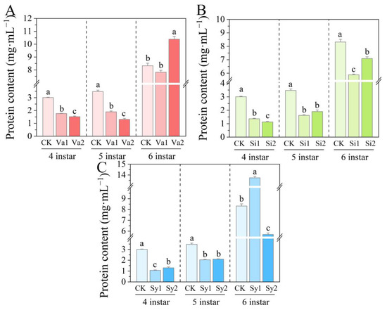 3.3. Changes in Protein Content of S. frugiperda Larvae