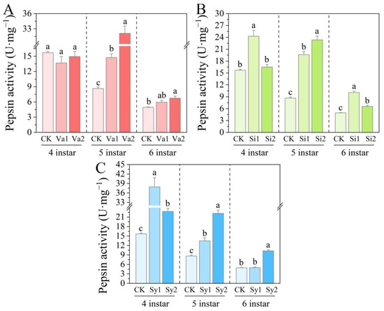3.4. Changes in Pepsin Activity of S. frugiperda Larvae