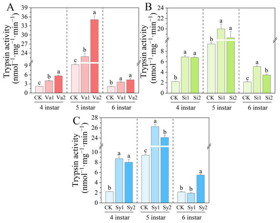 3.5. Changes in Trypsin Activity of S. frugiperda Larvae
