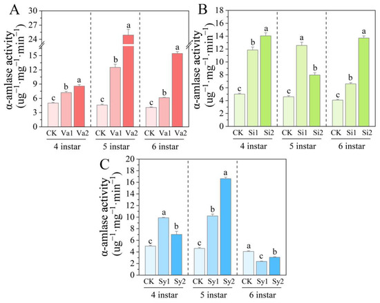 3.6. Changes in α-Amylase Activity of S. frugiperda Larvae