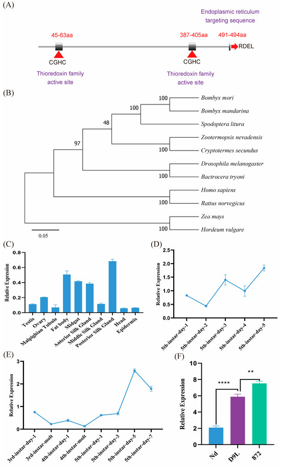 Evolutionary relationship and expression patterns analysis of BmPDI. (A) Schematic diagram of BmPDI structural domain. aa: amino acids. ‘CGHC’ and ‘RDEL’ represent thioredoxin active site sequence and endoplasmic reticulum targeting sequence, respectively. (B) Phylogenetic analysis of PDI. (C) qRT-PCR analysis of BmPDI transcripts in different tissues in the fifth instar on day 3. (D) qRT-PCR analysis of BmPDI transcripts at different developmental stages. (E) qRT-PCR analysis of BmPDI transcripts in the posterior silk glands at different developmental stages. (F) qRT-PCR analysis of BmPDI transcripts in the posterior silk glands in different lines in the fifth instar on day 5. Nd, the cocoon silk mutant strain; D9L, the normal silk-yielding strain; 872, the high silk-yielding strain. **** p < 0.0001, ** p < 0.01 (Student’s t-test).