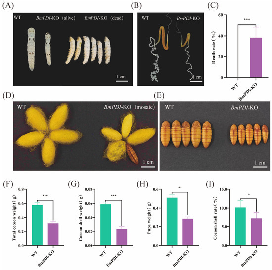 During feeding of the BmPDI-KO and WT silkworms, some individuals in the BmPDI-KO group exhibited significant phenotypes of smaller body size, delayed development, approximately 38.46% lethality during the larval stage, and smaller silk glands than WT silkworms (Figure 3A–C). Some of the BmPDI-KO individuals that successfully developed to the silk-spinning stage produced smaller cocoons with thinner cocoon shells, failed to spin silk, and finally became naked pupae (Figure 3D,E). The total cocoon weight, cocoon shell weight, pupal weight, and cocoon shell rate of the BmPDI-KO individuals were statistically analyzed and showed a significant decrease compared to the WT individuals (Figure 3F–I), indicating that knockout of the BmPDI significantly affected the silk yields of silkworms.