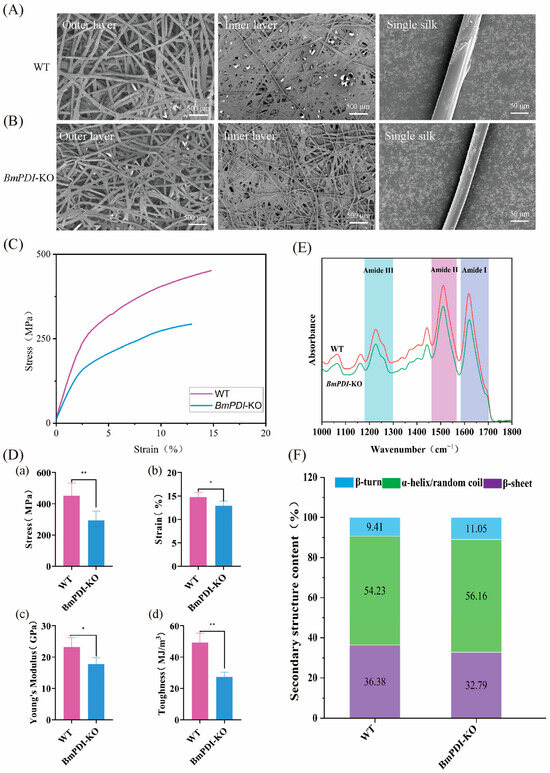 We further analyzed the effect of BmPDI knock-out on the microstructure of the cocoons. The morphologies of the outer surface, inner surface, and single silk fibers of the BmPDI-KO cocoons, which were sparser, thinner, and finer than those of the WT cocoons, were observed by SEM (Figure 4A,B). The average diameter of a single silk fiber from the BmPDI-KO strain was approximately 14.55 μm, which decreased by 23.9% compared to the approximately 19.13 μm of the WT strain. Subsequently, the mechanical properties of silk from the WT and BmPDI-KO cocoons were compared, which showed that the mechanical properties of the BmPDI-KO silk were significantly lower than those of the WT silk (Figure 4C); the breaking strength, breaking strain, Young’s modulus, and toughness decreased by 35.10%, 12.59%, 23.44%, and 44.44%, respectively (Figure 4E), suggesting that the deletion of BmPDI affected the mechanical properties of silk.