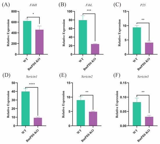 To further understand the effects of BmPDI knock-out on the synthesis or secretion of silk proteins, the expressions of silk protein-related genes were detected using qRT-PCR. The expressions of fibroin- and sericin-related genes were significantly downregulated at the mRNA level, among which FibH, FibL, and P25 were downregulated 1.4, 3.3, and 2.3 times, respectively (Figure 5A–C), and Sericin1, Sericin2, and Sericin3 were downregulated 4.3, 1.8, and 2.6 times, respectively (Figure 5D–F), implying that the deletion of BmPDI gene affected the synthesis or secretion of silk proteins.