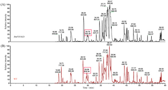 LC-MS/MS spectra to detect disulfide bonds of silk proteins from WT and BmPDI-KO silkworms. (A) LC-MS/MS spectrum of silk proteins from the BmPDI-KO silkworm. (B) LC-MS/MS spectrum of silk proteins from the WT silkworm. Red boxes represent that the peak times and intensities significantly differ between WT and BmPDI-KO strains. WT, wild-type; BmPDI-KO, BmPDI-knockout.