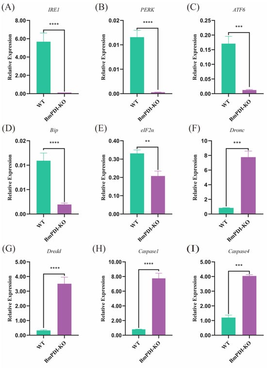 PDI is closely related to the unfolded protein response (UPR) in ER stress response [35]. Subsequently, the expressions of the UPR and apoptosis pathway-related genes were detected using qRT-PCR. The transcript levels of the UPR pathway-related genes were significantly downregulated in the BmPDI-KO silkworm; IRE1, PERK, and ATF6 were downregulated 351, 41, and 13 times, respectively, whereas Bip and eIF2α were downregulated 5 and 1 times, respectively (Figure 7A–E). However, some key apoptotic pathway genes, such as Dronc, Dredd, Caspase1, and Caspase4, were significantly upregulated 8, 10, 9, and 2 times, respectively (Figure 7F–I). These results suggested that deletion of the BmPDI gene severely suppressed the expression of UPR pathway-related genes and substantially promoted the expression of apoptotic pathway-related genes, which accelerated the apoptosis of silk gland cells and inhibited silk gland growth and development.