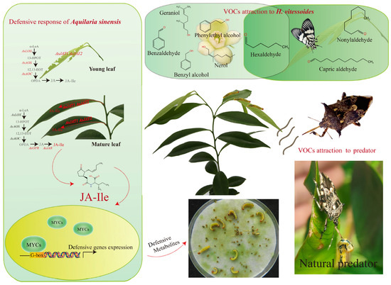 The tritrophic system involving H. vitessoides, A. sinensis, and C. concinna exhibits fascinating dynamics (Figure 2). Under natural conditions, healthy and undamaged leaves and flowers of A. sinensis release volatile organic compounds (VOCs) that attract adult H. vitessoides [66,67]. Four compounds—hexanal, (Z)-3-hexenyl acetate, nonanal, and decanal—extracted from the young leaves of A. sinensis have been identified as oviposition attractants for female H. vitessoides [106]. In flowers, 11 VOCs eliciting electroantennographic (EAG) responses in both male and female moths have been identified. Among these, heptanal and hexanal elicit the strongest EAG responses in females and males, respectively, with females showing a preference for benzaldehyde and males showing a preference for caryophyllene. Notably, A. sinensis flowers emit stronger floral scents at night, coinciding with the peak activity periods of H. vitessoides emergence, foraging, and mating, highlighting the pest’s adaptation to its host plant [107]. Following herbivory, A. sinensis can produce specific volatiles that repel H. vitessoides adults while attracting the predatory stink bug C. concinna. Damaged plants are more attractive to C. concinna than undamaged ones, with this attraction persisting for up to three days [108]. Beyond VOC-mediated interactions, A. sinensis employs direct defensive mechanisms against H. vitessoides feeding. Resistant A. sinensis plants exhibit strong inhibitory effects on larval feeding activity, impairing larval development. Specifically, neonate and early fifth-instar larvae avoid resistant plants, and larvae feeding on resistant leaves experience prolonged developmental periods, reduced survival rates, lower pupal weights, and shorter adult lifespans [109]. Further investigations into resistance mechanisms have revealed that the soluble sugar and protein contents in A. sinensis leaves are negatively correlated with resistance, while the flavonoid and tannin contents are positively correlated [110,111]. Our recent study explored the mechanisms underlying A. sinensis responses to H. vitessoides feeding and mechanical damage. The results indicate that the jasmonate (JA), salicylic acid (SA), and ethylene (ET) pathways are involved in the plant’s defense responses. Repeated mechanical damage enhances A. sinensis resistance to H. vitessoides larvae, with mature leaves potentially exhibiting stronger defensive responses than young leaves. The JA pathway plays a dominant role in this process [112]. Following mechanical damage (MD) and herbivore-induced wounding (HW), spatial compartmentalization of jasmonate biosynthesis gene expression was observed across different leaf tissues. Transcriptional analysis revealed that AsOPR (12-oxophytodienoate reductase, involved in JA precursor synthesis), AsJAR (jasmonoyl-L-isoleucine synthetase, responsible for JA-Ile activation), and AsJATs (jasmonate transporter) exhibited significant upregulation (p < 0.01) in mature leaves (ML). In contrast, their upstream biosynthetic genes—including lipoxygenase (LOX), allene oxide synthase (AOS), and allene oxide cyclase (AOC)—showed predominant activation in directly damaged younger leaves (YL) (Figure 2). This spatial distribution pattern suggests two potential mechanisms for JA-Ile accumulation in ML: (1) transport of JA-Ile or its precursors from locally damaged YL through the vascular system, or (2) de novo synthesis from mobile intermediates.