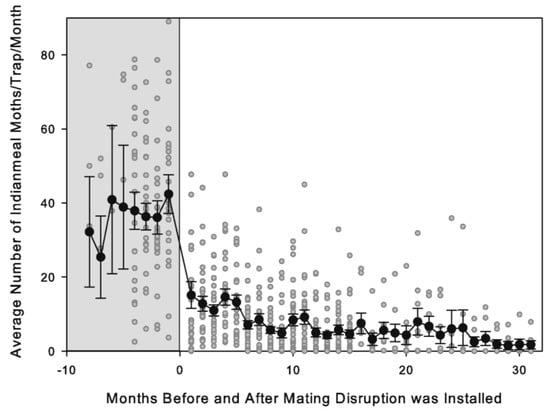 Number of Plodia interpunctella males caught in pheromone-baited traps per one-month monitoring period before and during mating disruption (MD) treatment in retail pet stores (black circles: mean ± SEM of all the stores; gray dots: individual store means; grey section indicates prior to start of MD treatment.