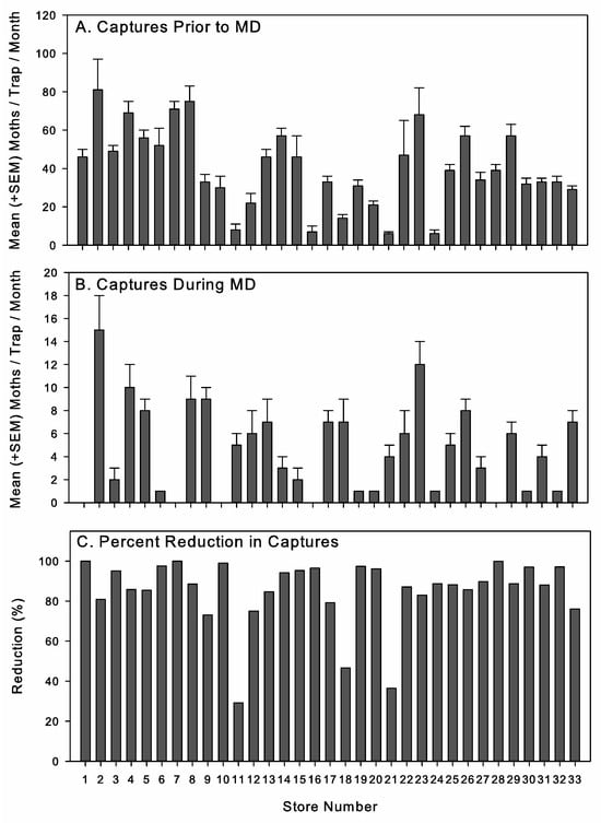 Although the stores shared many common features, there was considerable variation in the number of P. interpunctella captured prior to starting the MD program (Figure 2A) and during the MD program (Figure 2B) among individual stores. This probably reflects differences among the stores in their pest management, stock rotation, and sanitation practices, although it was not possible to quantify this fully given the limited visitations to the stores. The percentage reduction in moth captures under MD was relatively high across the stores, with the few exceptions tending to be stores that had a lower moth density prior to the start of the program (Figure 2C).
