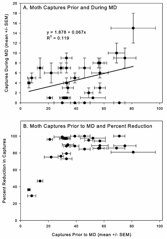 MD is predicted to be less effective at higher insect densities when competitive mechanisms are involved, but there was not a significant relationship between average number of moths captured per store prior to MD and the number of insects captured under MD (F = 3.502; d.f. = 1, 26; p = 0.073). There was a slight upward trend to the data, but the R2 value was relatively low (Figure 3A). Plotting the relationship between the percentage reduction and moth capture levels prior to MD, it was consistently between a 70 and 100% reduction (Figure 3B), except in the stores with very low initial moth densities, where reduced efficacy is likely an artifact due to variation in captures observed over time.